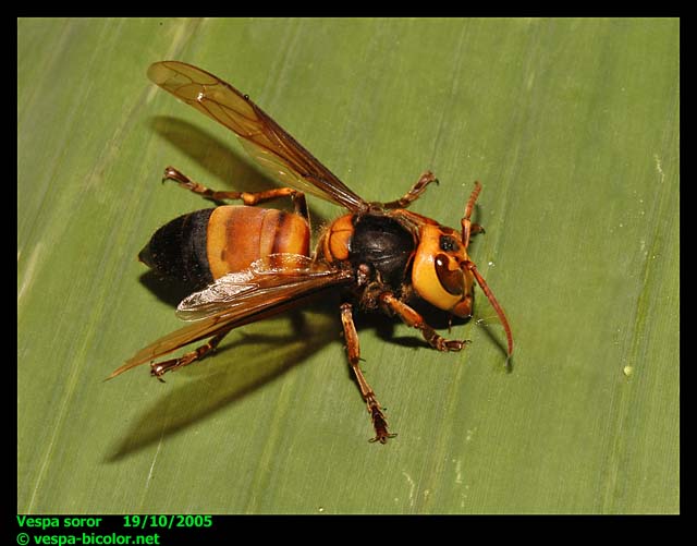 This species is also similar in appearance to Vespa soror; in fact, I considered all such wasps in Hong Kong to be Vespa ducalis until I noticed substantial differences in structure and behaviour and then sent specimens for expert verification. Vespa ducalis is smaller and more slender than Vespa soror; it has a normal sized head (not greatly widened behind the eyes), and the stripes of various colours on the abdomen are darker and far more contrasting than those on Vespa soror (shown below). It is important to be able to differentiate the two species in the field, for both species differ greatly in temperament and it would be risky to mistake a nest of Vespa soror for that of the gentle Vespa ducalis!