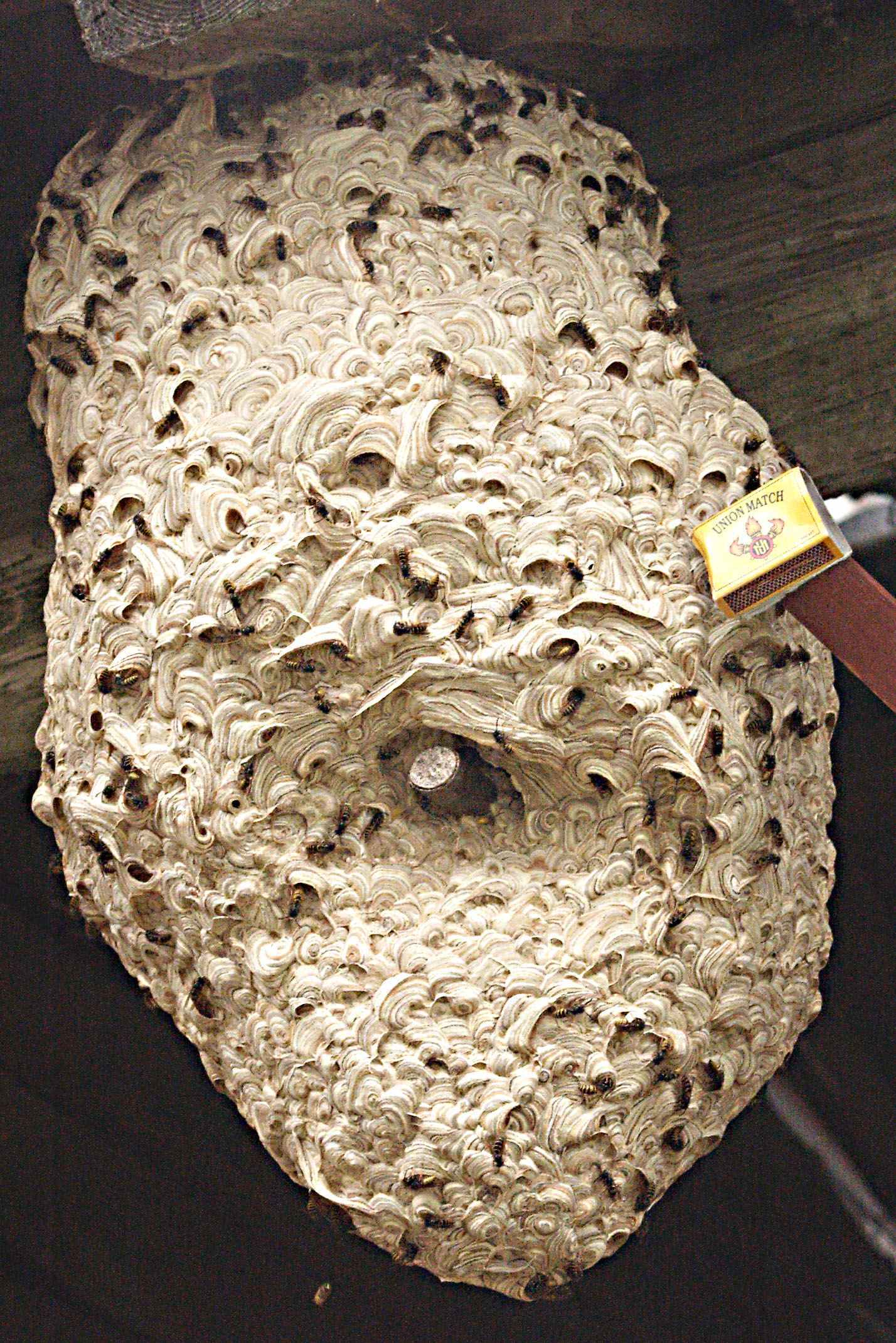Vespula germanica usually nests underground. It has adapted very well to living near people and often nests underground in gardens and lawns. Colonies reach extremely large sizes, with thousands or even tens of thousands of wasps in a single nest. It will also readily use crevices in buildings, where it becomes a serious problem due to its highly defensive nature and the difficulty in removing such nests. Furthermore, Vespula germanica is one of the most common species around garbage dumps and outdoor gatherings.